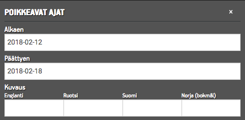 Ensimmäiset kentät koskevat poikkeuspäivämäärää. Voit muokata niitä paneelissa tai vetämällä poikkeusta aikajanalla.